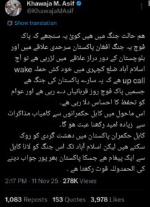 خواجہ آصف نے سوشل میڈیا پر بیان دیتے ہوئے کہا کہ موجودہ حالات میں کابل کے حکمرانوں سے کامیاب مذاکرات کی توقع رکھنا حقیقت پسندانہ نہیں ہے۔ انہوں نے واضح کیا کہ اگرچہ کابل پاکستان میں دہشت گردی روکنے کی صلاحیت رکھتا ہے، مگر یہ حملے اسلام آباد تک پہنچ کر ایک واضح پیغام دے رہے ہیں، جس کا پاکستان بھرپور جواب دینے کی صلاحیت رکھتا ہے۔